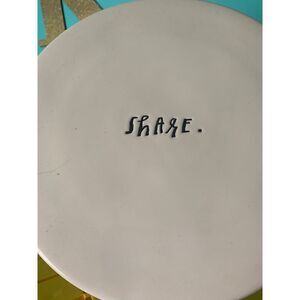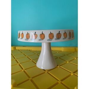 This super cute seasonal Rae Dunn cake and pie stand features pumpkins printed around the edge of the stand and it has the word Share in the center.