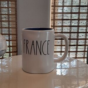 Rae Dunn coffee mug. France is on the front. The Eiffel Tower is on the back. The inside of the cup is purple.