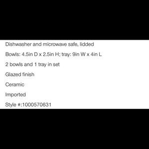 Bowls: 4.5in D x 2.5in H; tray: 9in W x 4in L