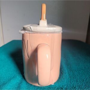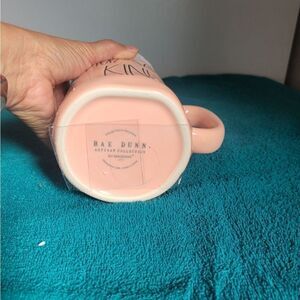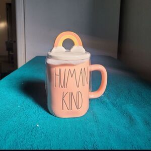 New in original box. excellent for gifting. Rea Dunn mugs with topper in human kind print . Very pretty peach color