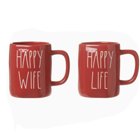 Rae Dunn x 2 Red Large Mugs HAPPY WIFE HAPPY LIFE NEW