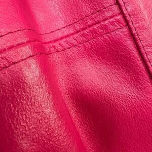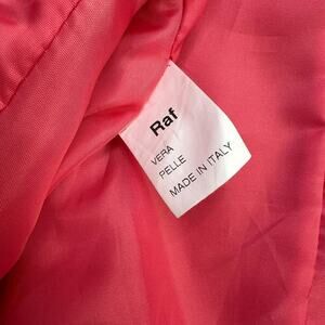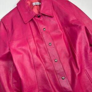 Raf Vintage Hot Pink Leather Snap Front Shacket /Jacket. Made in Italy. 100% genuine leather. Snap front closure. Two front pockets. Fully lined. One pocket has a hole in the lining, not noticeable from the outside. Stain on the inside snap placket, see photo. Womens size Medium.