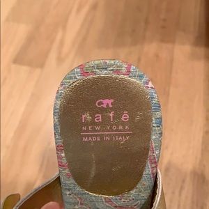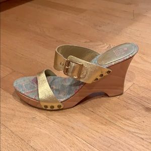 Selling super cute semi-worn heels. They have a pink/green/blue base and the straps are a shiny gold. They have a light brown wood styled heel.
