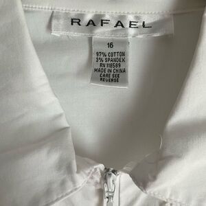 Blouse Zip Front Collar by Rafael in White with Front Ruffled Swirl Design Sleeve Slit Cuffs Women Size 16