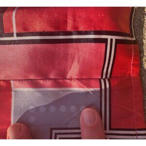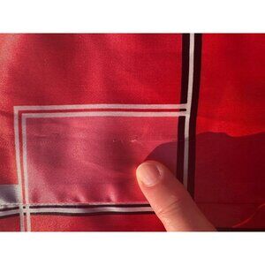This Rafael women's button-down shirt, size 14, combines a vibrant red geometric print with a smooth polyester blend for comfort and durability. It features long sleeves, a collared neckline, and button cuffs. Pre-owned with minor fabric flaws as shown.