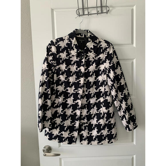 Rafaela Studio Jacket in a houndstooth patern of black and cream. has pockets and nice black buttons lined.