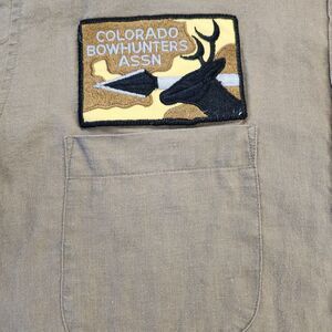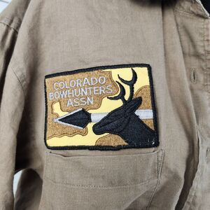 A Colorado Bowhunters Association patch has been ironed on (not original to the piece), adding a touch of vintage Americana and outdoorsy edge