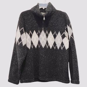 Makes you look like an academic, which is definitely ideal. Quarter zip fleece pullover fuzzy soft jacket. Heathered gray with with grey argyle pattern, very cozy and not itchy, generous size medium.