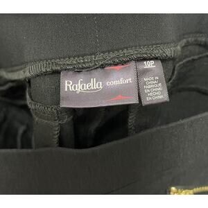 These are Rafaella black ankle pants in size 10P for women. The pants feature a solid pattern with a pull-on closure and a mid-rise waist of 32 inches. They are made of a comfortable knit fabric blend of spandex, nylon, and rayon. The pants have a flat front with gold zipper accents on the pockets, a straight leg style, and a 29-inch inseam. Perfect for a stylish and comfortable look with a touch of metal theme. In excellent condition with very little wear, look almost new Measures approximately 16” across waist laying flat with a 29” inseam and a 10” rise A6