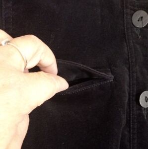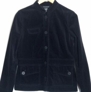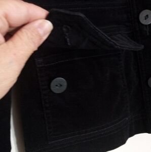 Stylish women's black velvet utility jacket with mandarin collar, angled flap pockets and tiny breast pocket. Stretch fabric and a fitted style that's perfect for any occasion. Stylish and versatile. Great pre-owned condition with no flaws noted.