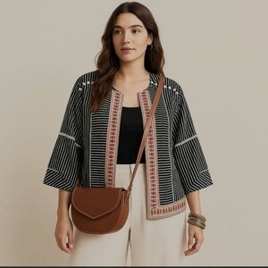 Stylish woven black and white stripes, embroidered open front jacket.