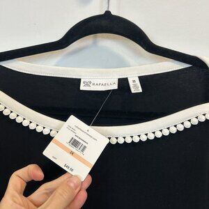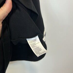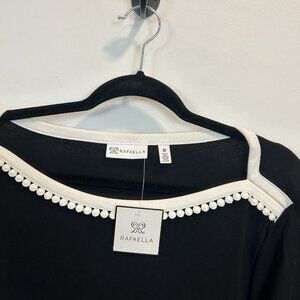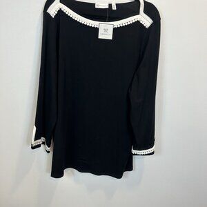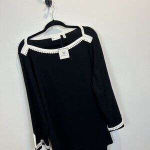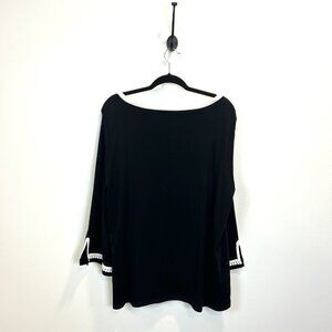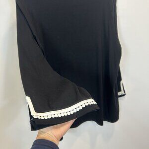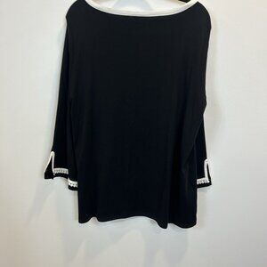 Elegant black top with white trim. Features long sleeves and a square neckline. Perfect for casual or formal wear.