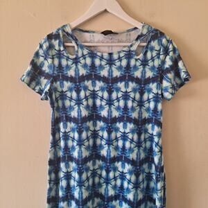 Rafaella Blue, White & Green Tie Dye 100% Cotton Crewneck Short Sleeve Dress with Shoulder Cut-out designs - Size M