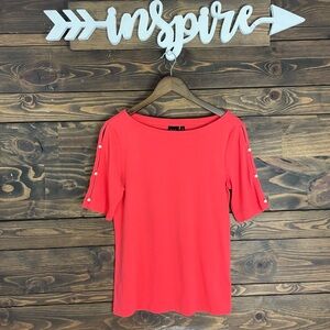 Rafaella | Boat Neck Coral Quarter Sleeve Top Split Open Sleeves Pearl Button