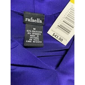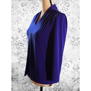 Rafaella Career Casual Women's Medium Purple Stretch V-Neck Pleated Preppy Top. Elegant and versatile Rafaella blouse in a striking deep purple shade. Features pleated shoulder details, a flattering V-neckline, and a relaxed drape for comfort and sophistication. Perfect for polished workwear, evening outings, or pairing with jeans for a chic casual look.