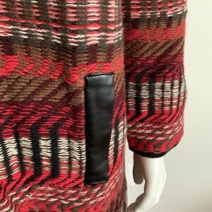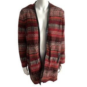 Rafaella Duster Cardigan Long Sleeve Faux Leather Trim Red Multicolor LP