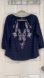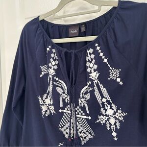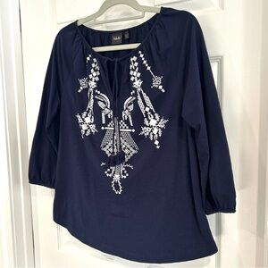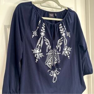 Rafaella Embroidered Peasant Boho Navy Blue White 3/4 Sleeve Scoop Neck Knit Top Blouse Size Large