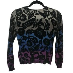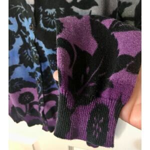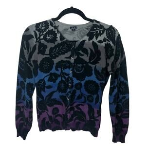Rafaella gray, blue, & purple gradient dyed cardigan with black florals. Long sleeve, 100% cotton.