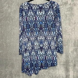 Rafaella L Large Shirt Top Blue Geometric 3/4 Sleeve Scoop Neck Asymmetrical Hem Stretch Casual