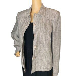 This vintage blazer is an ideal addition to any wardrobe, offering a sophisticated look with its subtle pinstripe pattern and structured shoulder pads. Its classic button-up style makes it a versatile choice for professional settings or formal events. Embrace timeless elegance with this tailored piece.