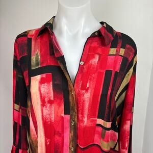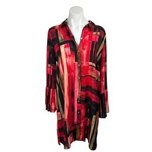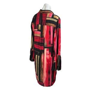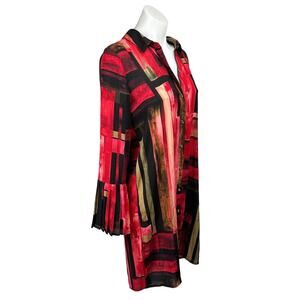 Rafaella Red Colorful Abstract Geometric Print Button Down Collared Pleated Long Bell Sleeve Side Slit Lightweight Retro Style Midi Casual Career Business Shirt Dress Sz 6