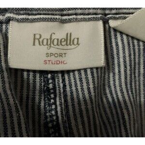 The Rafaella Pants in size 12 feature a stylish blue and white striped nautical pattern, perfect for a casual yet chic look. Made from a blend of linen and cotton, these pants have an ankle drawstring closure for a customized fit. The cargo style and flat front design add a practical touch to the fashionable nautical theme, making them ideal for the spring and fall seasons. Perfect for women who appreciate both comfort and style in their wardrobe choices.