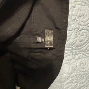 Solid black with slat zipper pockets. VERY comfortable. Hint of stretch makes them so comfortable. Can be dressed up or casual.