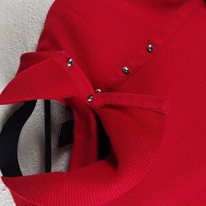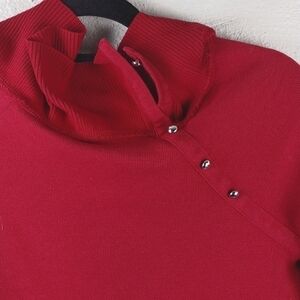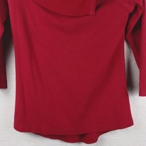 Rafaella Women's Red Shawl Collar Long Sleeve High Low Hem Below The Waist Pullover Sweater. 96% Cotton, 4% Spandex. Straight Front Hemline. Round Back Hemline. Silver Buttons Collar Detail. Measurements approx. Flat Lay. Pit to Pit: 17, Sleeves: 22, Front Length: 24.5, Back Length: 26.5 Size Small. Like New Condition. Color May Vary Due To Lighting.