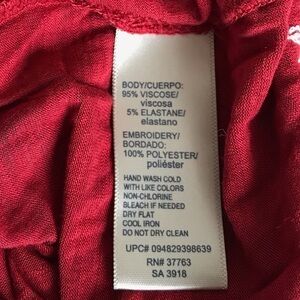 Red, short sleeve tee with white embroidery. Preowned with discolored spot on side of back. See last photo.