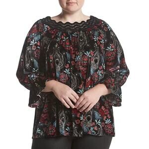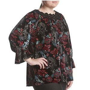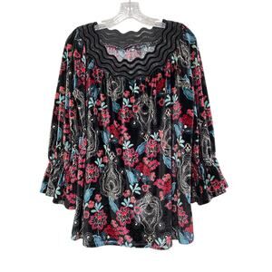Rafaella Size L Velvet Floral Print Scallop Trim Blouse Top Elastic Ruffle Cuff