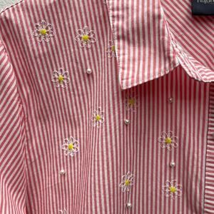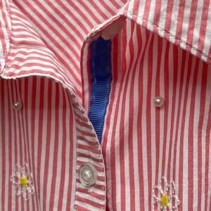 Rafaella Stripe Button Front Shirt Embroidered Daisies & Bead Embellished. Size XL. Adorable daisy embroidery on front along with white bead embellishment. Long roll-tab sleeves and bottom side slits. Blue grosgrain trim at side slits and inner button placket.