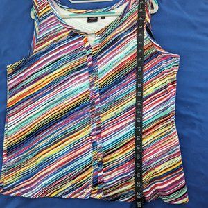 Make a statement in this vibrantly multi-colored sleeveless tank top. It has a split neckline closed by a metal embellishment. In Women's XL, it is 100% stretch cotton, so has a nice forgiving fit. I found it to be TTS; see pics for measurements. It looks great under a solid-color blazer or sweater!