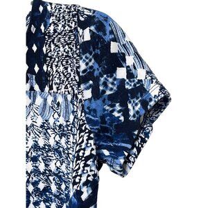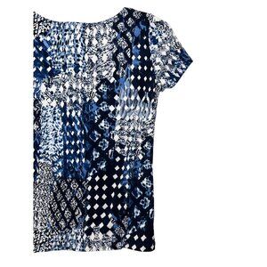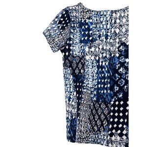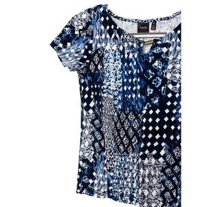 Classic and versatile, this Rafaella Studio women’s top features a blue and white patchwork-style print on soft cotton. With short sleeves and a flattering scoop neckline, it’s easy to dress up with trousers or wear casual with jeans. A timeless piece for work, weekends, or travel.
