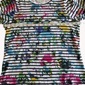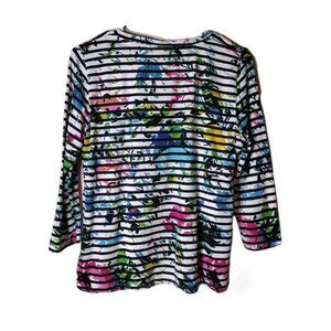 The Rafaella Top in Petite Medium is a stylish and versatile addition to any woman's wardrobe. This long sleeve top features a classic striped pattern with a round neckline and pullover closure, making it perfect for casual, workwear, or travel occasions. The top is made from a comfortable blend of cotton, modal, and elastane, with a casual sleeve type and studded accents for added flair. Easy to care for with machine washable material, this top is ideal for the seasons of summer, fall, and spring, offering a nature-inspired theme with a touch of colorful and classic style.