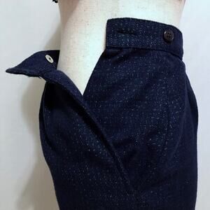 Excellent condition. Vintage Wool Blend Skirt for Women Size 2P. Knee Length, navy and green, 2 left side buttons for closure, 1 right side pocket, pleated style front, split bottom seam middle back, internal lining. Top and necklace are not included. Pictures are part of description.