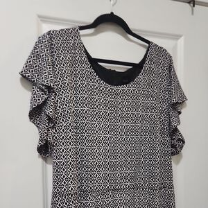 Chic and effortlessly stylish, this Rafaella jumpsuit features a flattering scoop neckline, flutter sleeves, and flowy wide legs. The black and white geometric pattern adds a modern touch, perfect for dressing up or down.