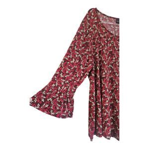 The Rafaella Women's 3X Blouse is a stylish and versatile top featuring a leaf pattern with gold dots, a scoop neck, and 3/4 ruffle sleeves. Made from a comfortable blend of polyester and elastane, this blouse offers a pullover closure and an asymmetric hem, perfect for various occasions including travel, parties, casual outings, and business meetings. The bell sleeves and stretch fabric add a touch of elegance and sophistication to this tunic style blouse from the Rafaella brand. Available in a plus size, this blouse is suitable for all seasons.