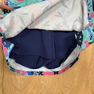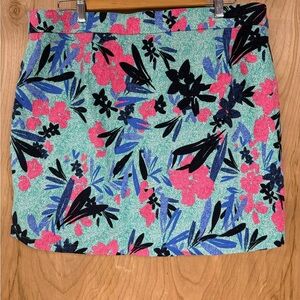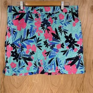 The Rafaella Skort in XXLarge features a tropical pattern in shades of green, blue, and red, making it perfect for travel and casual occasions. This versatile skort has a pull-on closure, elastic waist, and stretch material for comfort and ease of movement. Made from a blend of polyester, nylon, viscose, and elastane, this stylish skort is machine washable and showcases a logo accent. Perfect for tennis, travel, golf, pickleball, or simply hanging out in style during the summer, fall, or spring seasons.