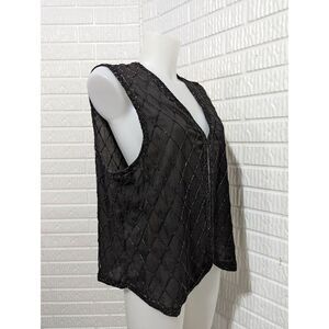 Add a dash of glam to your wardrobe with the Rafaella Women's Black Beaded Silk Vest in Size M. Beautifully crafted from luxurious silk, this striking piece is adorned with intricate beading patterns that exude elegance. The versatile black hue ensures it pairs perfectly with a wide range of colors, from bold brights to classic neutrals. Don this vest to instantly elevate your day-to-night ensembles and step out in chic, confident style.