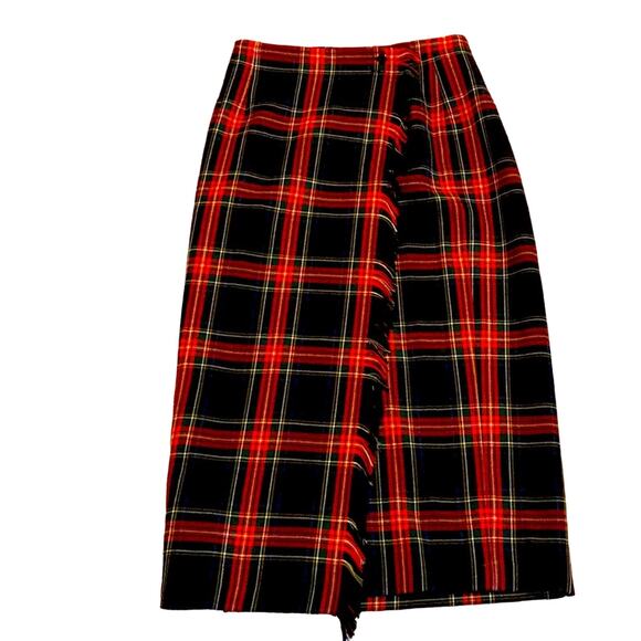 Classic Plaid Pure Wool True Wrap Around Skirt with Holiday Colors. Fringe Front. Waist 30” and Length 35”. Item 1022