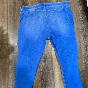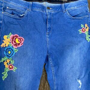 Flower power, but make it comfy. Rafaella plus-size jeans in a bright blue wash with multicolor floral embroidery at the hip and pocket, plus light distressing for lived-in charm. Classic 5-pocket styling, zip fly, and stretch denim for an easy, curve-friendly fit. Labeled 22W. Pre-owned in good condition with crisp color and plenty of stretch.