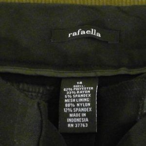 These Rafaella black slacks are 62% polyester, 33% rayon and 5% spandex. The mesh lining is 88% nylon and 12% spandex. They are size 14 and in good condition.