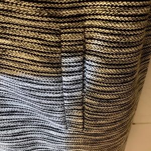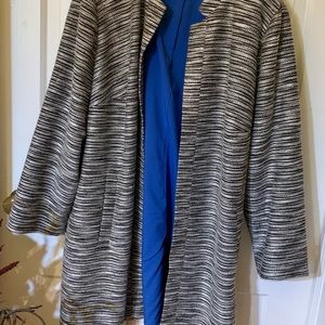 Rafaella long sleeve black/white open front lined jacket. Hits at mid thigh. Side slit pockets. Shell is 65% polyester 35% viscose. Blue lining is 100% polyester. Purchased at Lord and Taylor. Never worn.