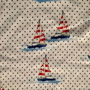 Grosgrain ribbon cross-cross detail at the neck. Cuffed short sleeves.