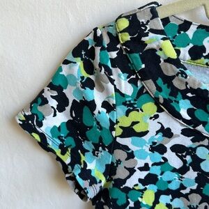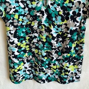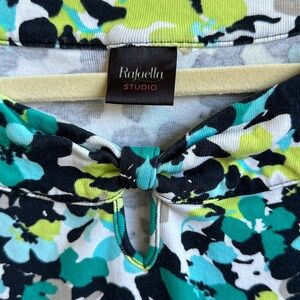 Rafaella short sleeve boatneck top with bow, cutout detailing at neckline, size S (see measurements below). Good preowned condition. Aqua/teal/black/white/green/tan.