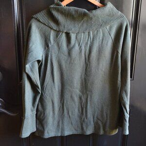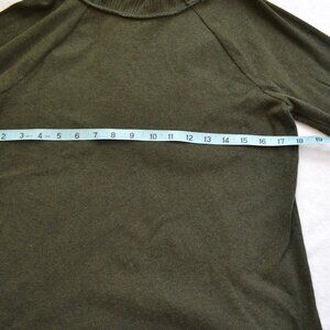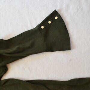 Olive green pullover sweater with detail silver studs at collar and on cute bell 3/4 sleeves. Rounded hem. size M. 58 % cotton. No wool.