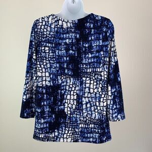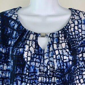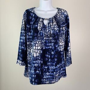Rafaella sz S Top Shirt Blue White Patterned Keyhole Neckline Stretchy Fabric