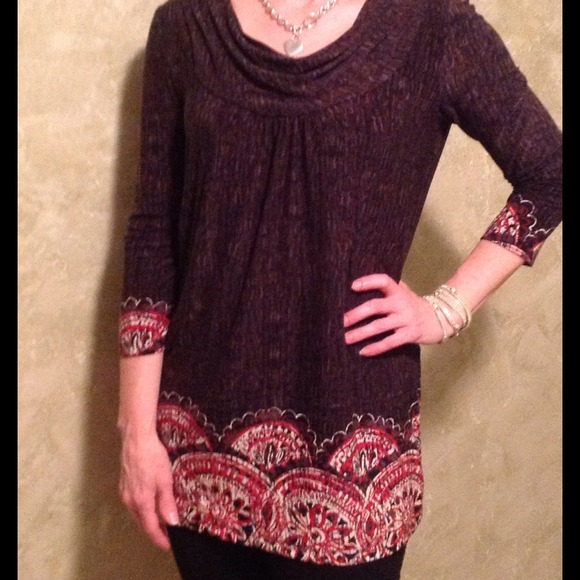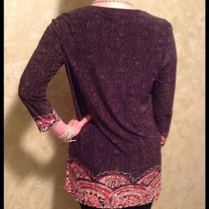 This top's fabric has a nice weight. I love the way it falls. Pair it with some black leggings and a lot of figure flaws will go unnoticed! 3/4 length sleeves. Great for spring days or evenings.