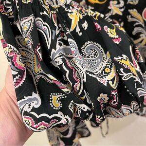 This fun black pattern scoop neck top is from Rafaella. The item has puffed long sleeves. The bottom has a bow tie. The top is sheer and made out of 100% polyester. The size is XL. The measurements are 24” L x 21” W (pit to pit) x 15” sleeve (shoulder to cuff). This top has been gently worn but is in very good condition. This item will be great with a pair of jeans.