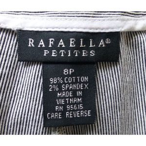 Rafaella Women's Pants Size 8 Seeer Sucker Capri Black White stripes stretchSize 8 Petite Waist 15 inches lying flat across Inseam 25 inches 98% Cotton, 2% SpandexNo stains or flaws Excellent used condition Email with any questions Sku# 7636